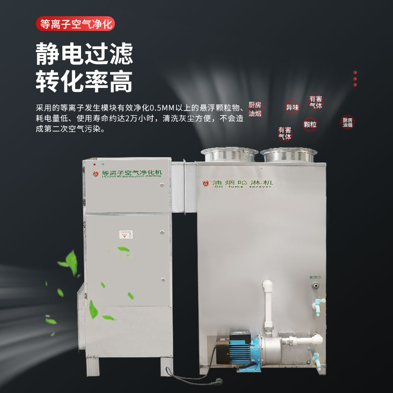 所產(chǎn)生的煙氣、油煙、惡臭異味等污染氣體,借助風機風力,進入油煙噴淋機,通過噴淋裝置對不同的污染氣體用不同的噴淋混合水進行噴淋霧化,使污染氣體中的大顆粒物在機內進行初效凈化,然后再進入等離子空氣凈化機對剩余的污染顆粒物,利用機內的等離子模塊進行靜電吸附在電極板表面,同時等離子模塊產(chǎn)生的負氧離子,對有毒有害的氣體分子進行催化氧化、分解等物理化學反應,使有毒有害的氣體分子轉化成無毒無害的氣體。